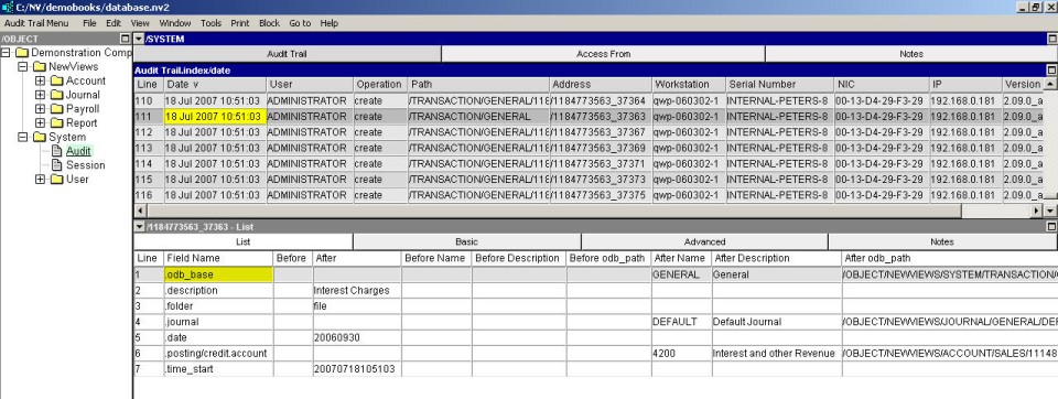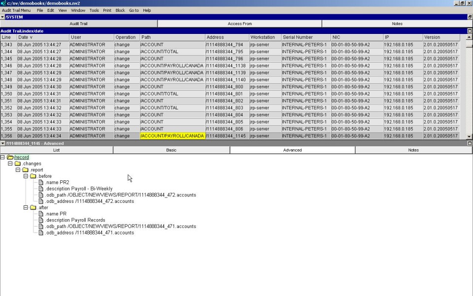NewViews maintains a complete audit trail of changes to accounting and security-related information. A complete audit trail is especially important in a multi-user environment where any number of users simultaneously access and modify the same database.