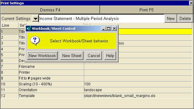 The New Sheet option will create a new, named sheet in the currently active Excel workbook. To append sheets to existing workbooks, switch to Excel, activate the target workbook, switch back to NewViews, issue the print command and select New Sheet.