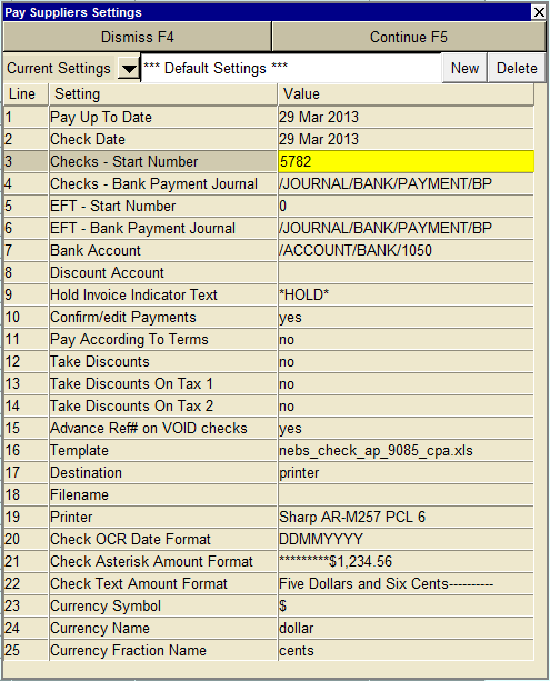 | 21 | Check Asterisk Amount Format | Controls the format of asterisks printed on the cheque (press <F3> to select). | |