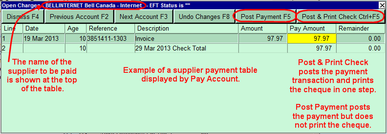 The Tools>Pay Account command is used to pay open supplier invoices, reconcile the payments with the invoices being paid, and optionally print the corresponding cheques or EFT payments detail advisory slips.