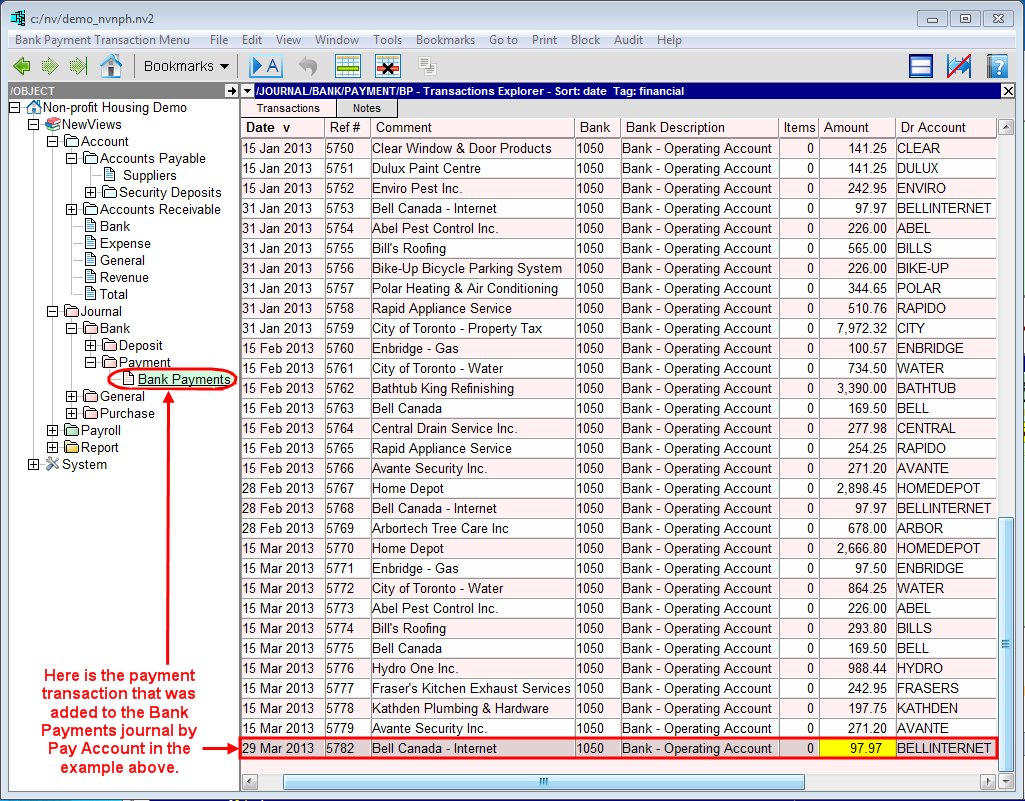 The Pay Account command adds a payment transaction to the Bank Payments journal for each supplier invoice paid. Corresponding entries also appear in the supplier account and the bank account.