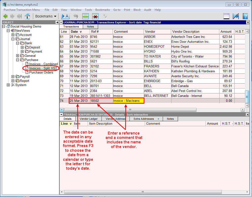 Use the command Edit>Append to add each purchase item to the detail window, using the example below as a guide. Note: Pressing <Enter> on the last field of an item will create a new item.