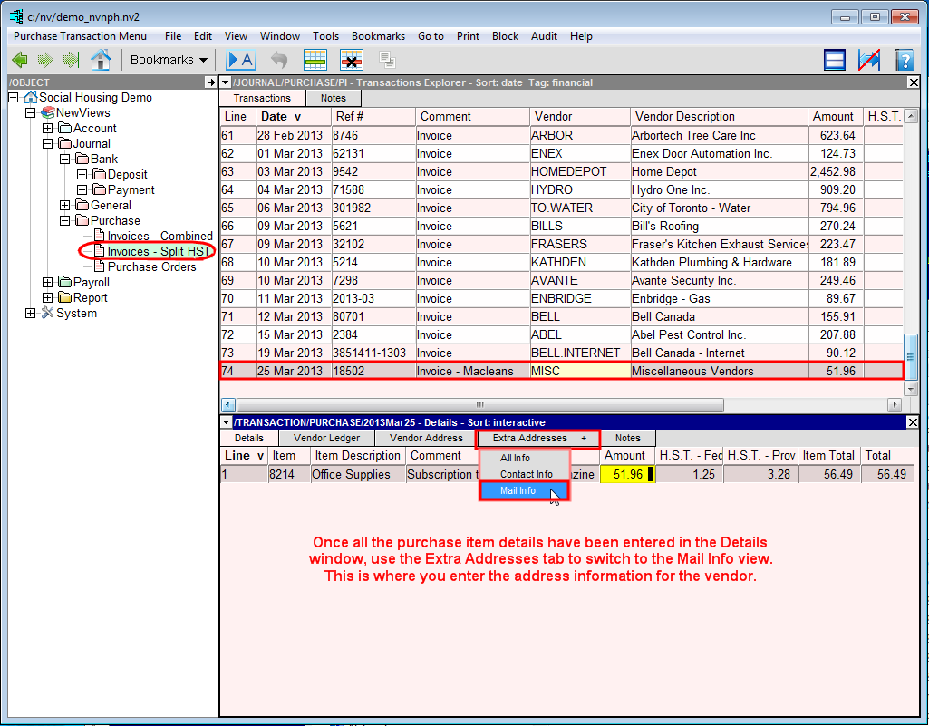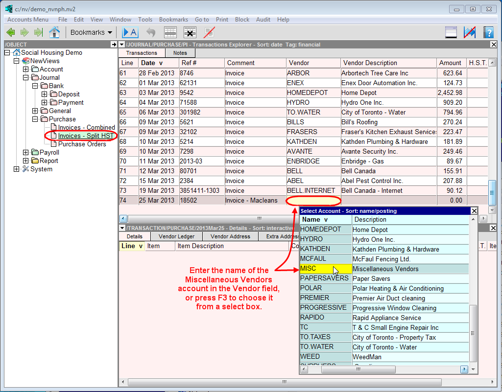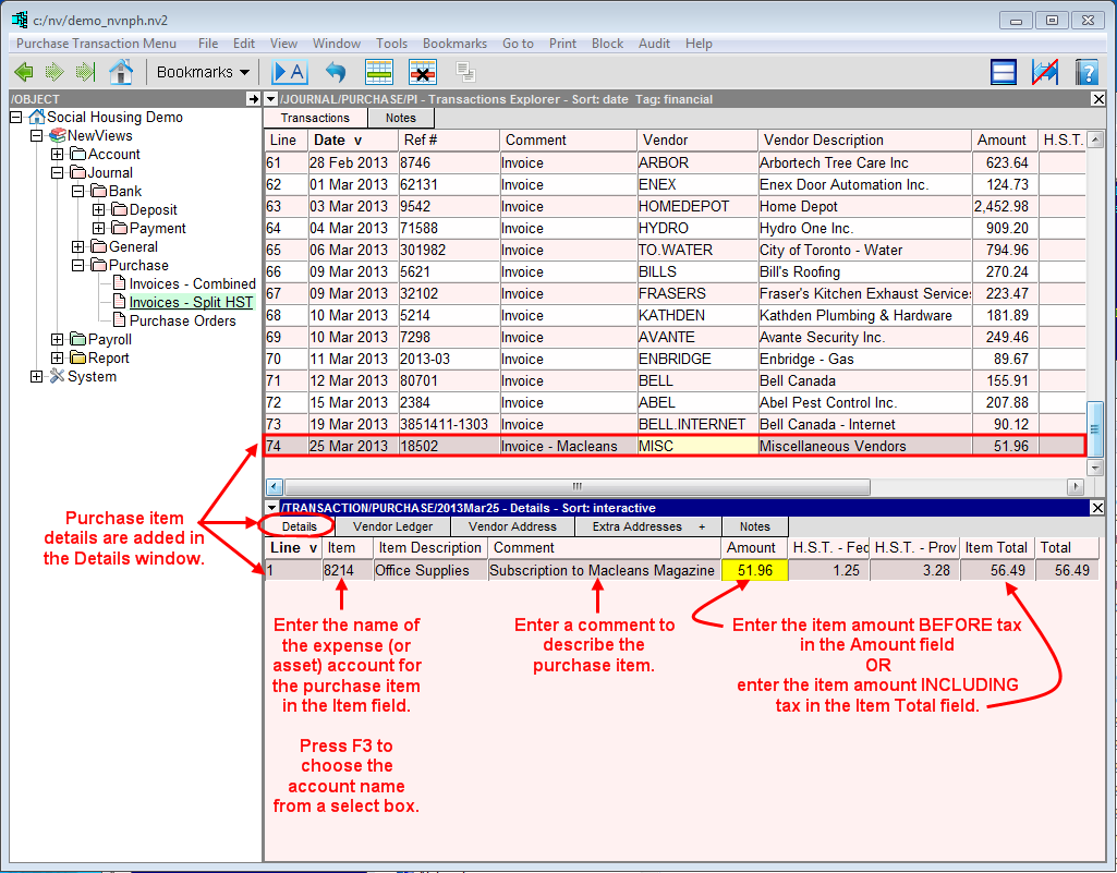 This type of purchase is added to the Purchase Invoices Journal. NewViews automatically calculates applicable taxes and rebates and adds corresponding transactions to the miscellaneous vendor, expense (or asset) and tax accounts.