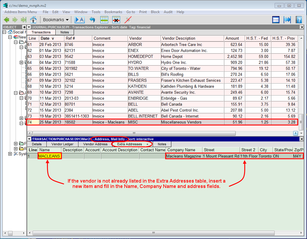 Note: All addresses that have previously been added for miscellaneous vendors will appear in the Extra Addresses view. Before adding any new information, check to see if the information for the vendor has already been entered. If so, it is not necessary to add it again.