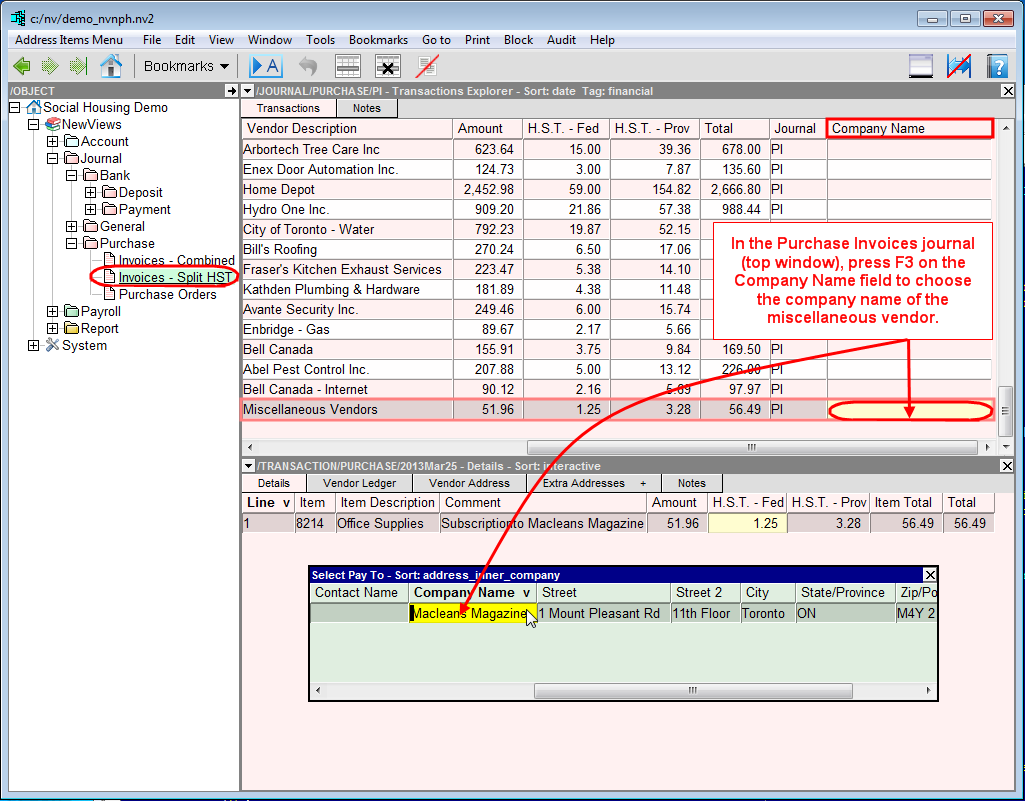 To link the company address information to the purchase transaction, return to the transaction in the top window and position on the Company Name field. Press <F3> to choose the company name from the table.