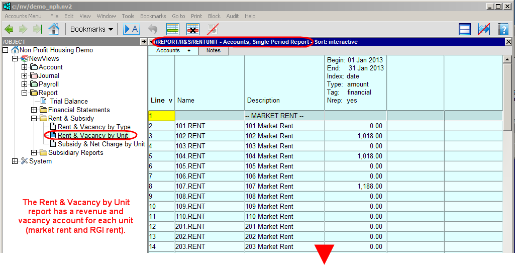 The Rent & Vacancy by Unit report can be found by expanding the following folders: NewViews/Report/Rent & Subsidy