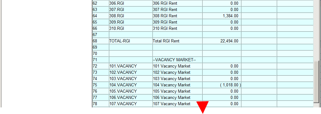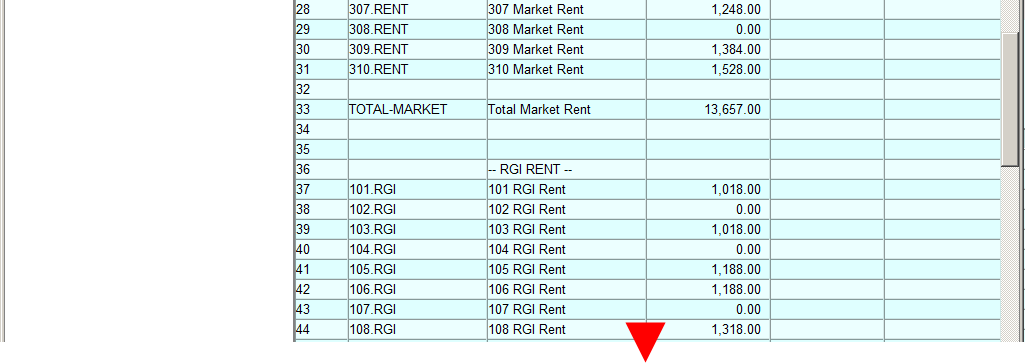 For example, if the occupant of Unit 101 is paying full market rent, account 101.RENT is used as the revenue account in the Income Register. If the occupant of unit 101 is paying RGI rent, account 101.RGI (see below) is used as the revenue account in the Income Register.