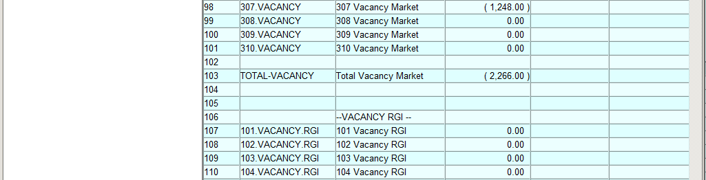 Vacancy Market - Revenue loss from vacant market rent units and total vacancy loss for market rent units. There is a market rent vacancy account for every unit, which is posted to through the Income Register if the market rent unit is unoccupied.