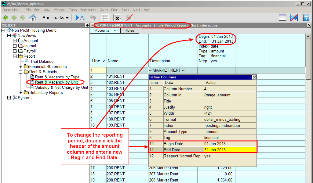 To change the reporting period, double click the header of the amount column, then enter the new Begin Date and End Date in the Define Columns prompt box.