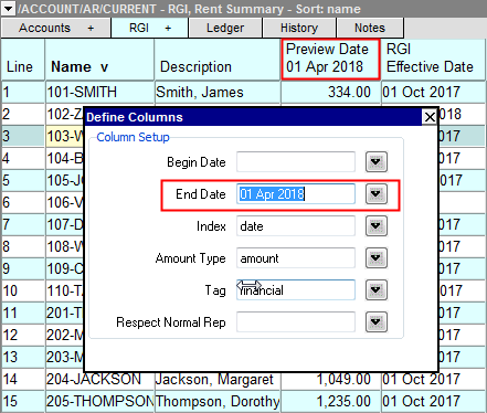 Note: Changing the preview date DOES NOT alter any RGI details that have been entered in the middle and bottom panes of the Rent Summary view.