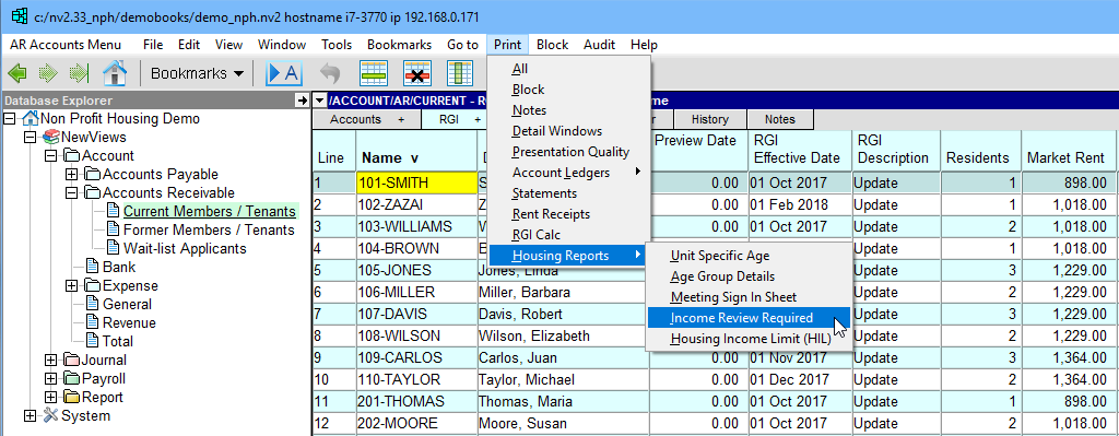 NewViews for Non-profit Housing provides a tool for printing a variety of reports on the members/tenants residing in the building. Currently, the following reports are available: Unit Specific Age, Age Group Details, Income Review Required, Meeting Sign In Sheet, and Housing Income Limit (HIL).