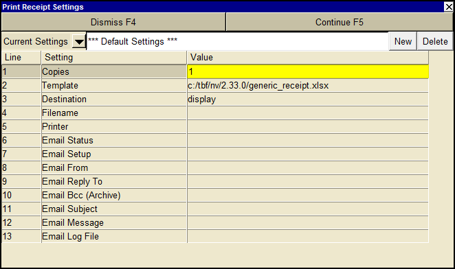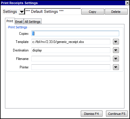 | 2 | Template | The template to be used to print the receipts(s). Press <F3> to select the template from an explorer (double click to select). Receipt templates supplied with NewViews contain the word "receipt" in their names. For example, "generic_receipt.xls". | |