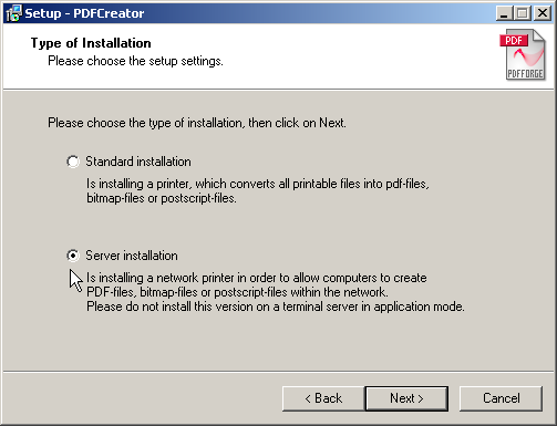 Version 1.3.1 of PDFCreator can be installed in one of two ways.