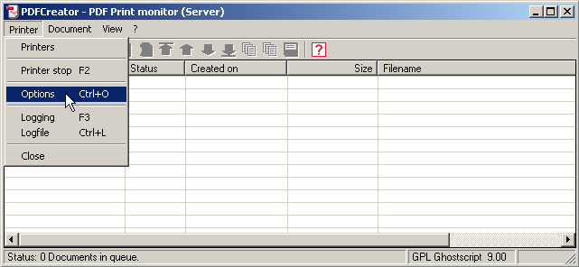 We need to make one setting change to the PDF print monitor. Please click on Printer>Options.
