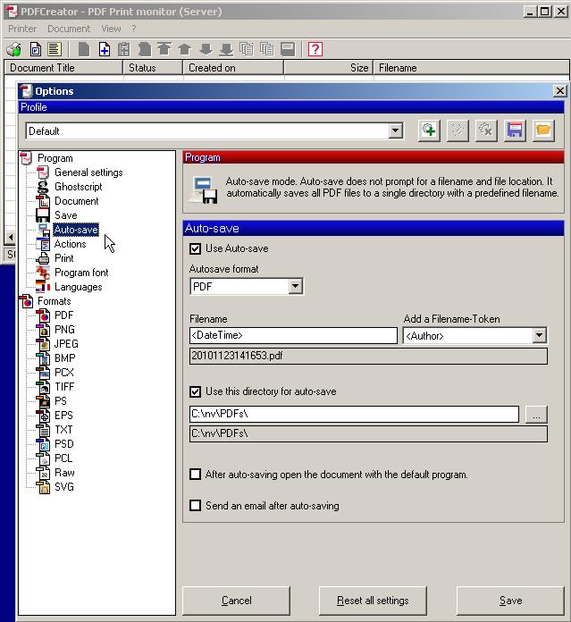 In the screen shot above the original text in Use this directory for auto-save listed C:\PDFs\REDMON_MACHINE\REDMON_USER\ as the directory for auto-save. You should edit this to read C:\nv\PDFs\ to store your temporary PDF files as shown.
