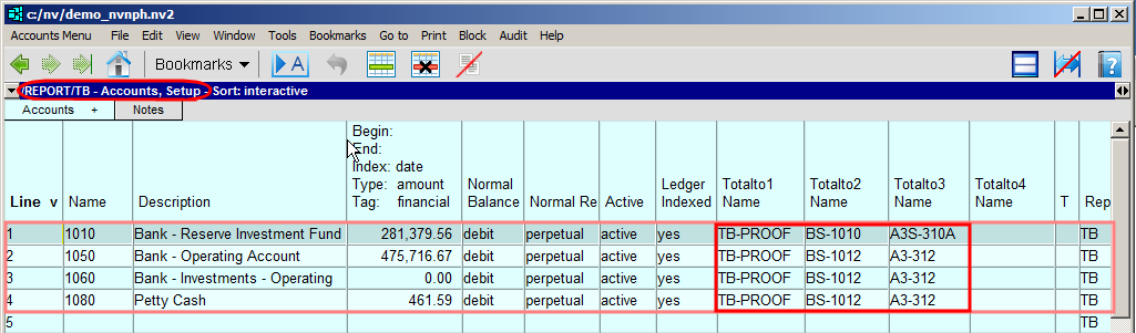 The example below shows the totaltos for four bank accounts on the Setup view of the Trial Balance.