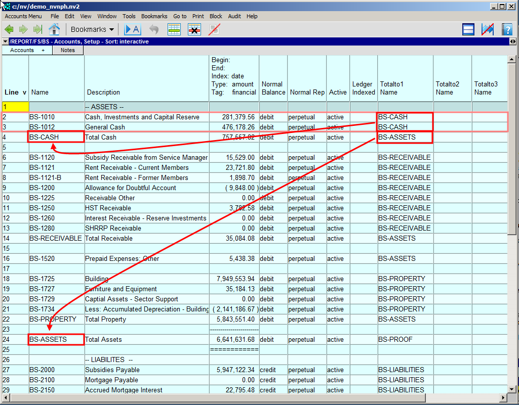We can follow the totaltos for these bank account to the Balance Sheet, where we can see that accounts BS-1010 and BS-1012 both total to BS-CASH, the Total Cash account. BS-CASH then totals to BS-ASSETS, the Total Assets account.