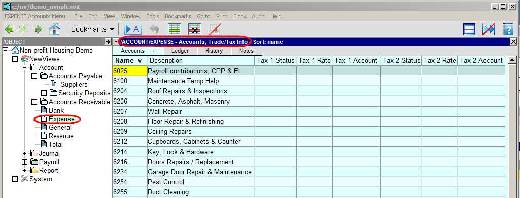 | Tax1/Tax2 Status | taxable - tax on purchases is charged. exempt - tax on purchases is not charged. empty - the default setting in the Purchase Journal is used. The purchase journal has a corresponding Tax1/Tax2 Status setting for whether or not tax is charged. The tax setting on an expense account has higher priority than the purchase journal so it provides the ability to override the purchase journal setting on an expense-by-expense basis. |