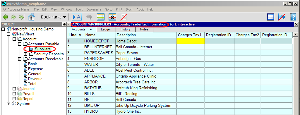 | Charges Tax1/Tax2 | yes - tax on purchases is charged. no - tax on purchases is not charged. empty - the default setting in the Purchase Journal is used. The Purchase Journal has a corresponding Tax1/Tax2 Charged setting for whether or not each tax is charged. The tax setting on a vendor account has higher priority than the purchase journal so it provides the ability to override the purchase journal setting on a vendor-by-vendor basis. |