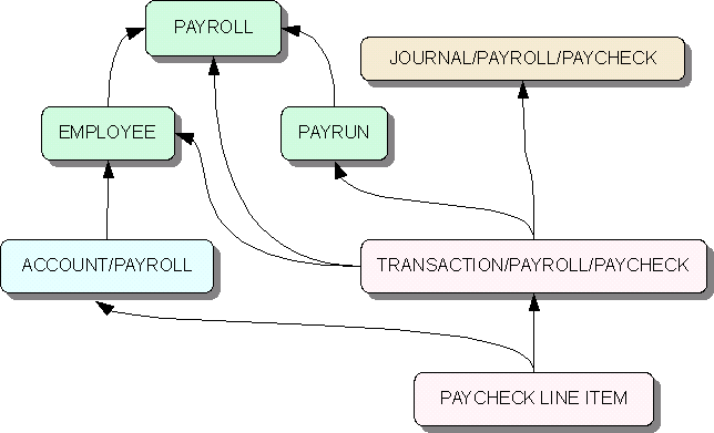 Each arrow in the diagram above represents a collection relationship between two types of objects. For example, a payroll object has a collection of employee objects, and correspondingly, each employee references, i.e. points to, its payroll; hence the arrow. A payroll also has a collection of payrun objects and a collection of paychecks, but more on this later.