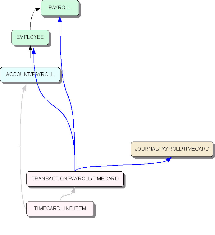 Although we show a lot of arrows, most were already shown earlier for (non-timecard) paychecks, or else serve exactly the same purpose for timecards as they did for paychecks. The only arrows of interest are the red arrows. One shows that a timecard references the paycheck that paid it, and that paycheck has a corresponding collection of the timecards it paid. The other red arrow shows that the timecard, like a paycheck, is connected to a payrun, in this case the payrun that generated the paychecks used to pay it.