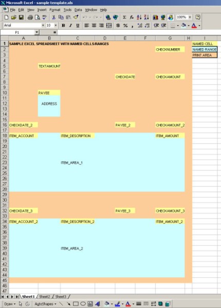 This is an example of a check template with two item areas (stubs). The text in upper case letters corresponds to range names that have been defined in the spreadsheet.