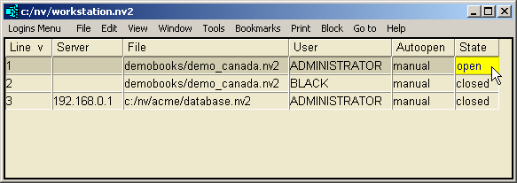 The next time you want to open the same database, there will already be a row for it, so all you have to do is change the State to open. Even that isn't necessary if the Autoopen field is set to automatic. See Opening Books Automatically.