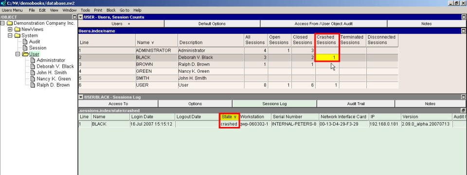 | crashed | A crash occurred while the user had this session open on the database. Some recently entered data may have been lost. It is impossible to determine the cause of the crash, or even whether it was NewViews or the computer on which it was running that crashed. If the database was open through a server then the crash occurred on the server side, not the workstation side. |