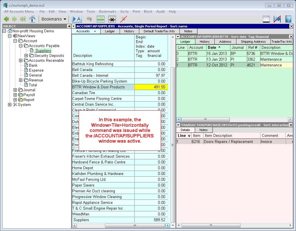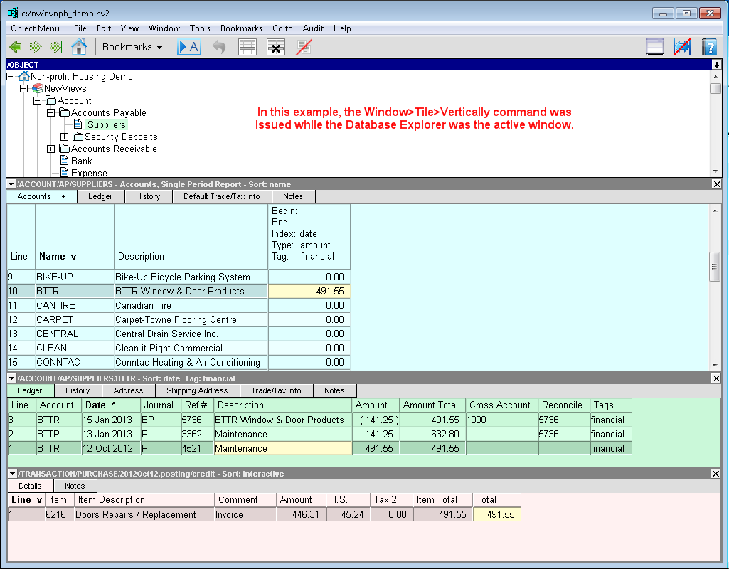 Windows can be tiled vertically or horizontally. When tiling, always make sure that the window you want to be at the top (for vertical tiling) or at the left (for horizontal tiling) is active (e.g. the title bar immediately above the window is dark blue).
