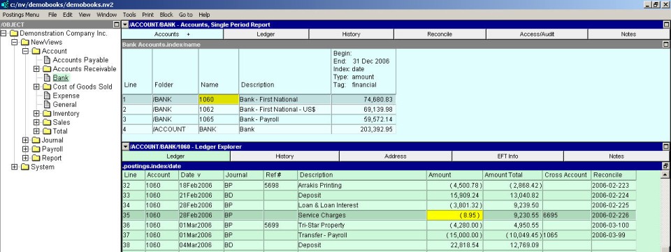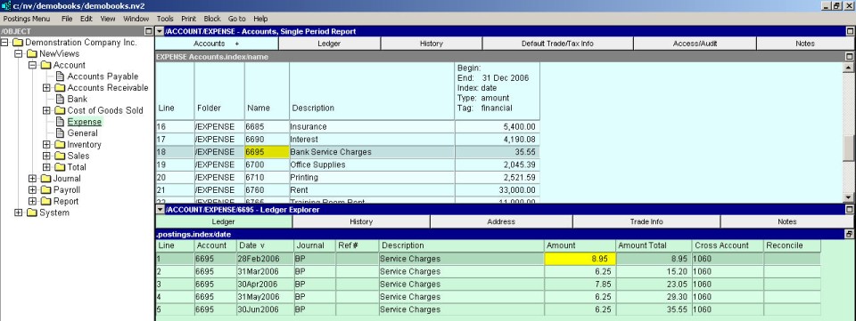 And the window below is the result of pressing <F9> on the journal item. NV2 has navigated the Database Explorer to show you the other account posted to (i.e. an Expense account for bank service charges).