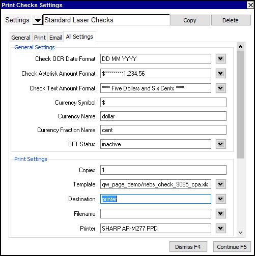 3. Issue the Print>Checks command and fill out the prompt as follows:
