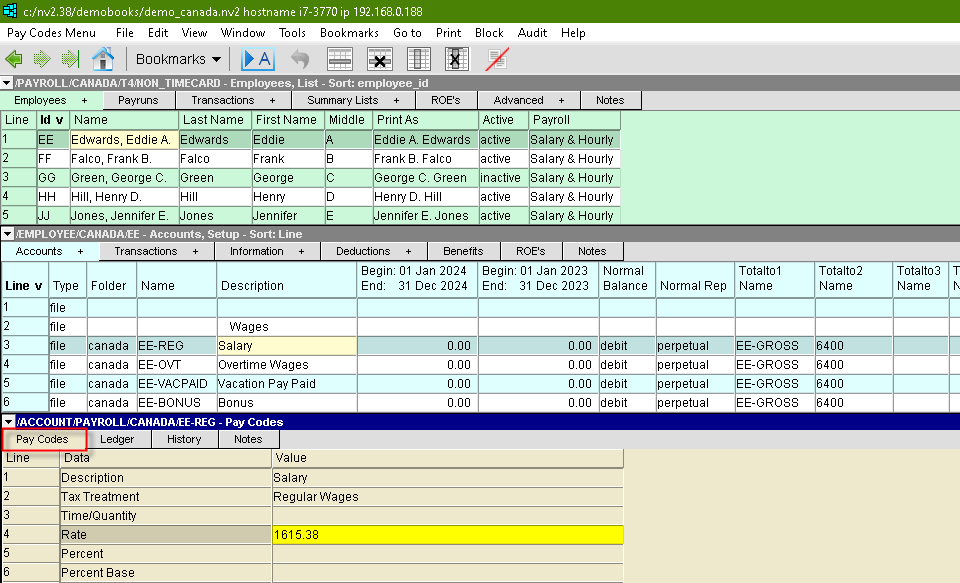 Employee accounts are viewed and edited in the Accounts Setup window, which is a split pane window. The top half (middle pane) displays a table of payroll accounts for the active employee. The bottom half (bottom pane) displays either a Pay Code window or a Ledger window for the active account. The window tabs below the title bar that reads ACCOUNT/PAYROLL/CANADA/(payroll account name) are used to switch between these two windows.