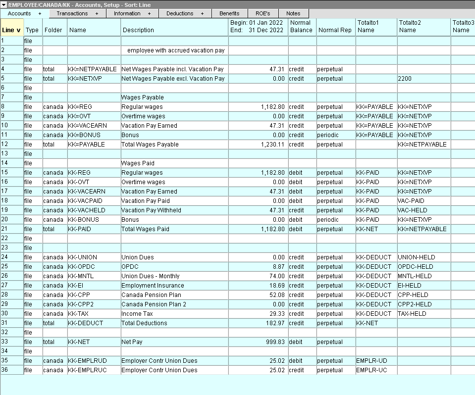 To pay an employee, the earnings and deductions are posted to a group of accounts that are specific to that employee. For example, a salaried employee, who has EI, CPP, and Income Tax deducted, would require four accounts; one for the salary earnings, and three for the deductions. An employee can have an unlimited number of earnings and deductions accounts.