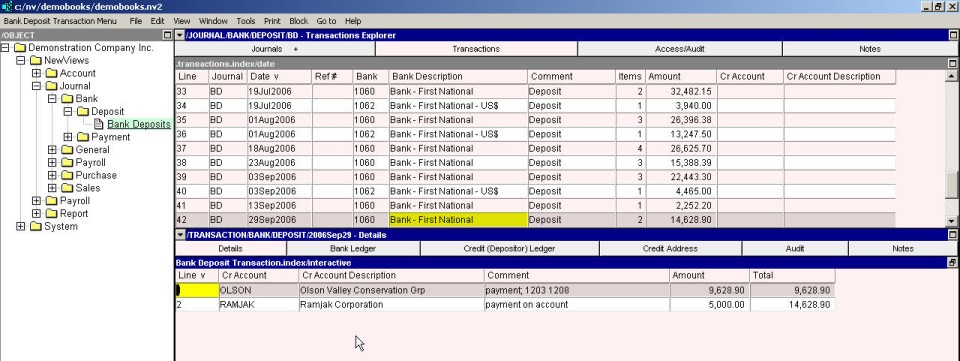 Click the Bank Deposits Journal (NewViews/Journal/Bank/Deposit/Bank Deposits) in the NV2 Database Explorer.