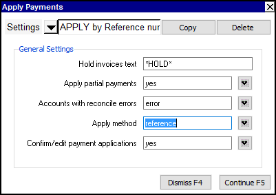 | Apply method | To reconcile payments with invoices on a first in, first out basis, enter FIFO (press <F3> to select). To reconcile payments with invoices on a last in, first out basis, enter LIFO. To reconcile payments with invoices by reference, enter reference. NOTE: To reconcile by reference, invoice references are placed in the description fields of payment items, either at the account ledger or transaction detail level. When more than one reference is entered, the references are separated by commas. |