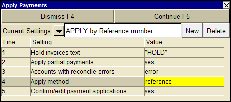 | Apply Partial Payments | If partial payments are to be applied (and boomerang transactions added if there is a remainder), enter yes (press <F3> to select). If partial payments are not to be applied (and no reconciliation is to be done if a payment cannot be applied evenly), enter no. |