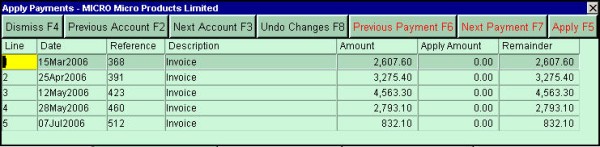 If no block is marked on the account table, the Apply Payments command will reconcile the account that is currently active. If a block of accounts is marked on the account table, the Apply Payments command will reconcile all the accounts in the block. If the Confirm/edit payment applications field on the Apply Payments prompt is set to yes, you can move through the account table and choose the accounts that are to be reconciled.
