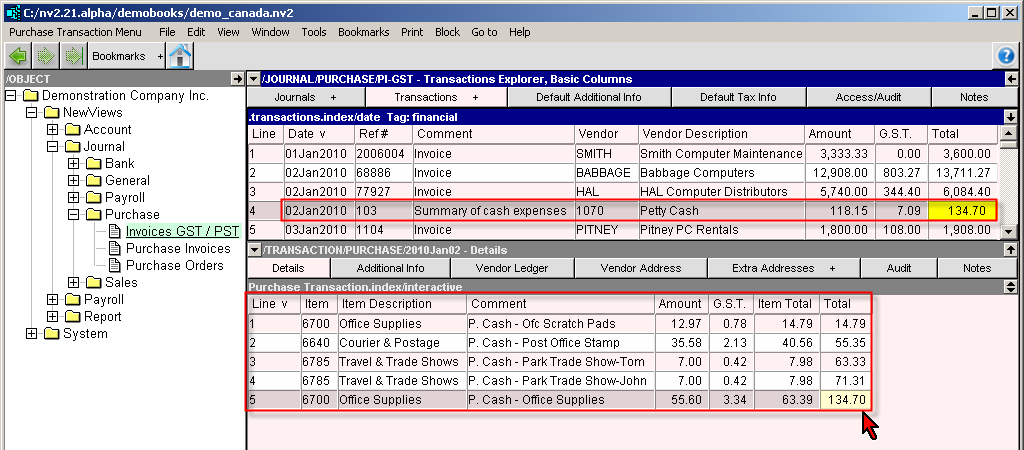 Click the Purchase Invoices Journal (NewViews/Journal/Purchase/Purchase Invoices) in the NV2 Database Explorer.