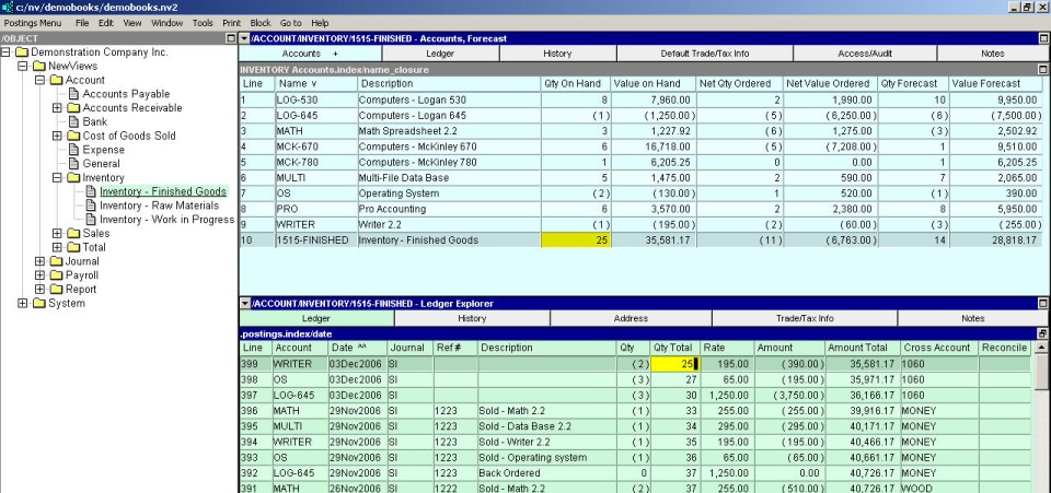 The inventory Forecasting window is used to display inventory quantities on hand, the net of inventory purchase orders and sales orders, and the sum of the two (e.g. quantity on hand + (purchase orders - sales orders). This window is useful for determining potential problems with sales order fulfillment, in which case the quantity forecast for any given inventory item would be negative.