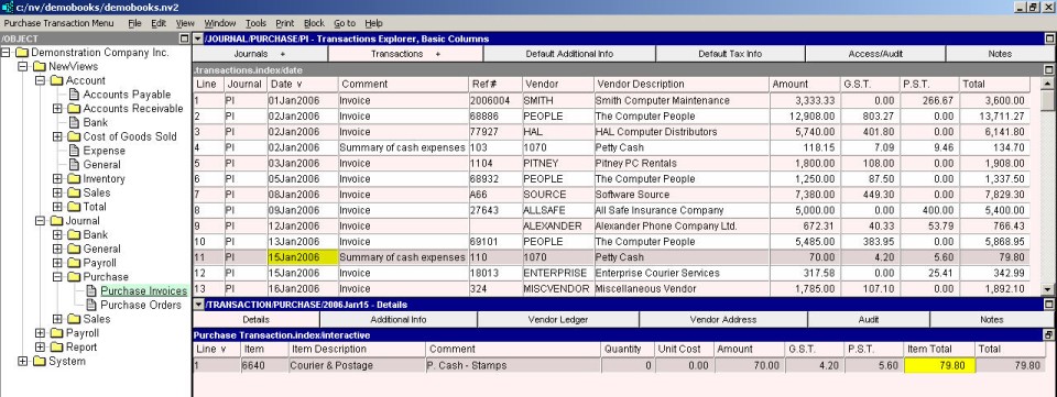 If the right window is not the Transactions Explorer window, click the window list button at the left of the title bar that reads /JOURNAL/PURCHASE/PI and choose Transactions Explorer).