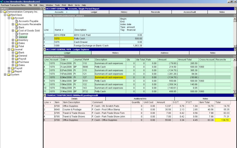 Adding a purchase made with petty cash involves debiting one or more expense/asset accounts and any applicable tax accounts, and crediting the petty cash account. With NV2, you don't have to be concerned with debits or credits when entering a petty cash purchase. You simply specify the petty cash account you are using, and the details of the items you are purchasing. Trade taxes, if applicable, are calculated and added automatically.