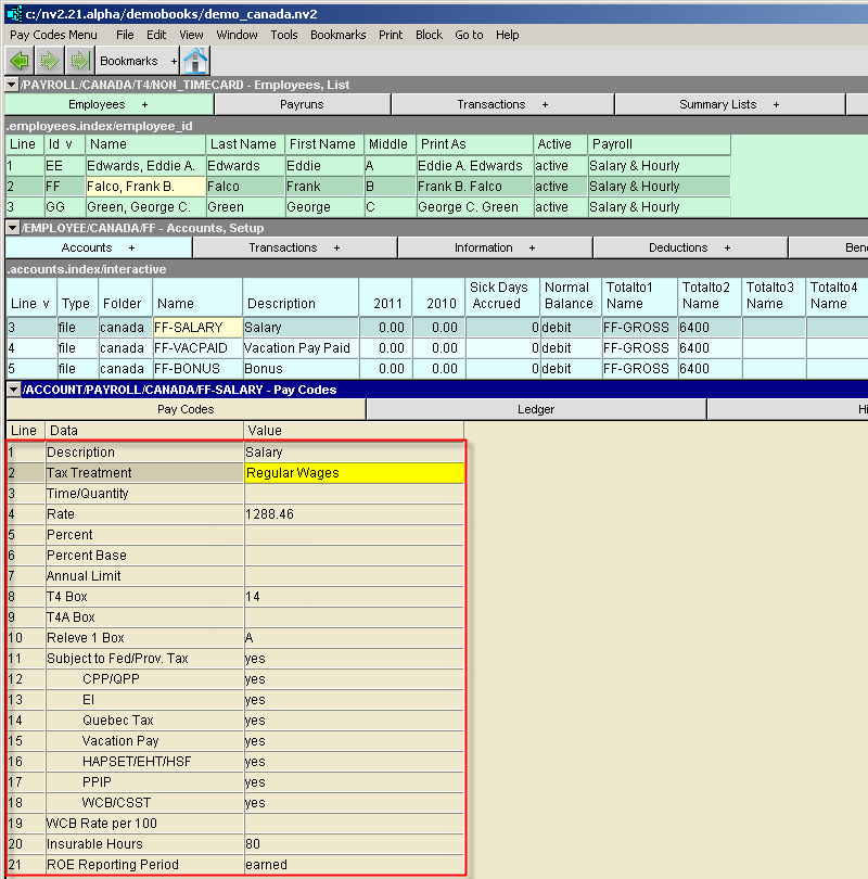 The pay code window contains a table of information (pay codes) that control how an account behaves when a paycheck is processed.