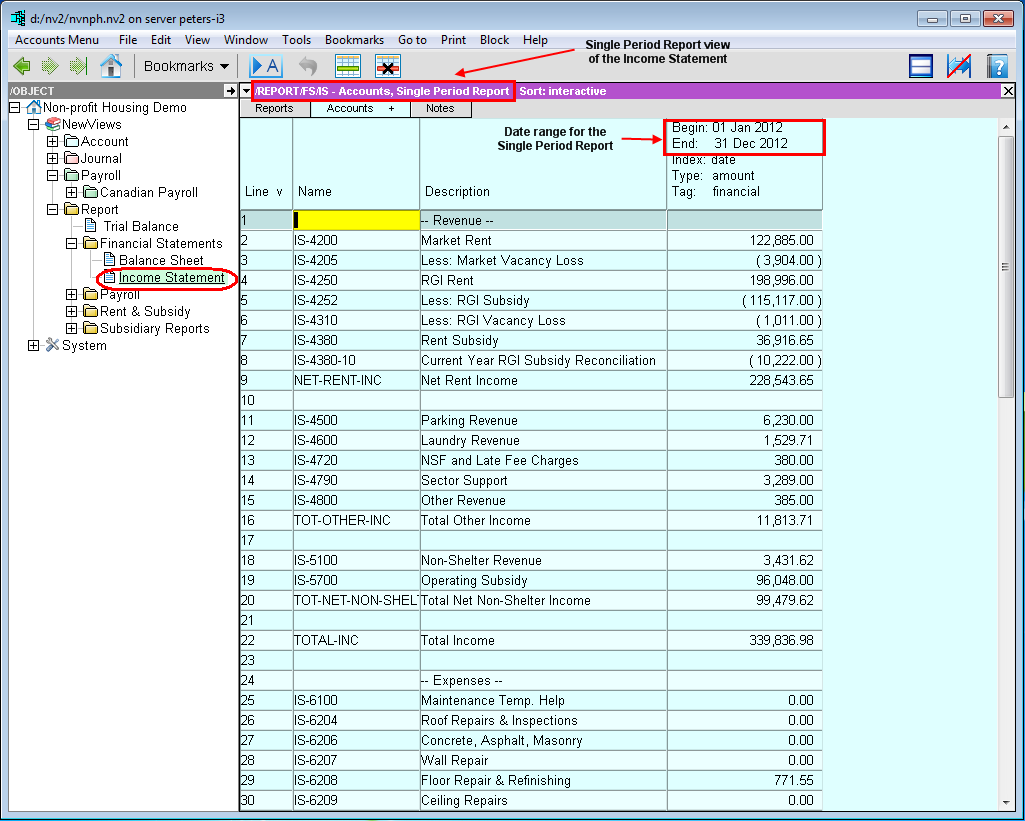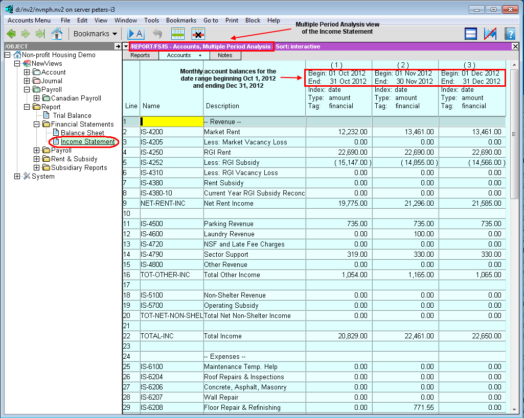 As an example, let's consider an Income Statement, which is essentially a collection of revenue and expense accounts. The Single Period Report view shows income statement account balances for a specific period. You could also choose to see account balances on a monthly basis for three months by using the Multiple Period Analysis view.