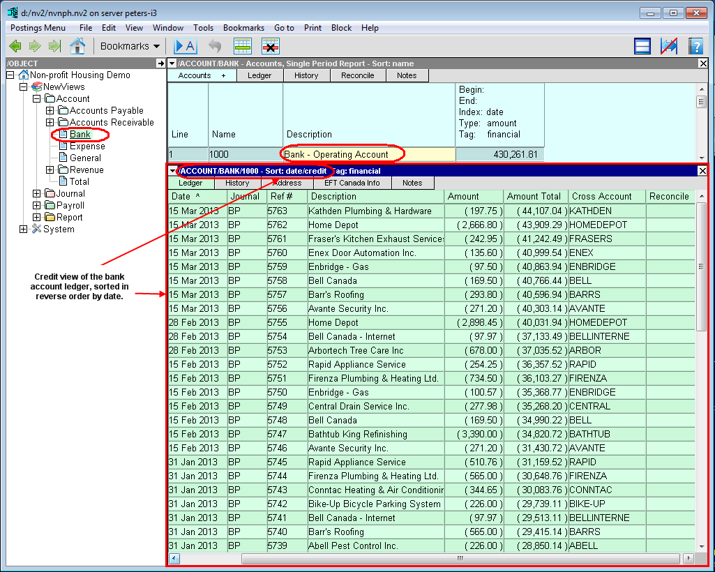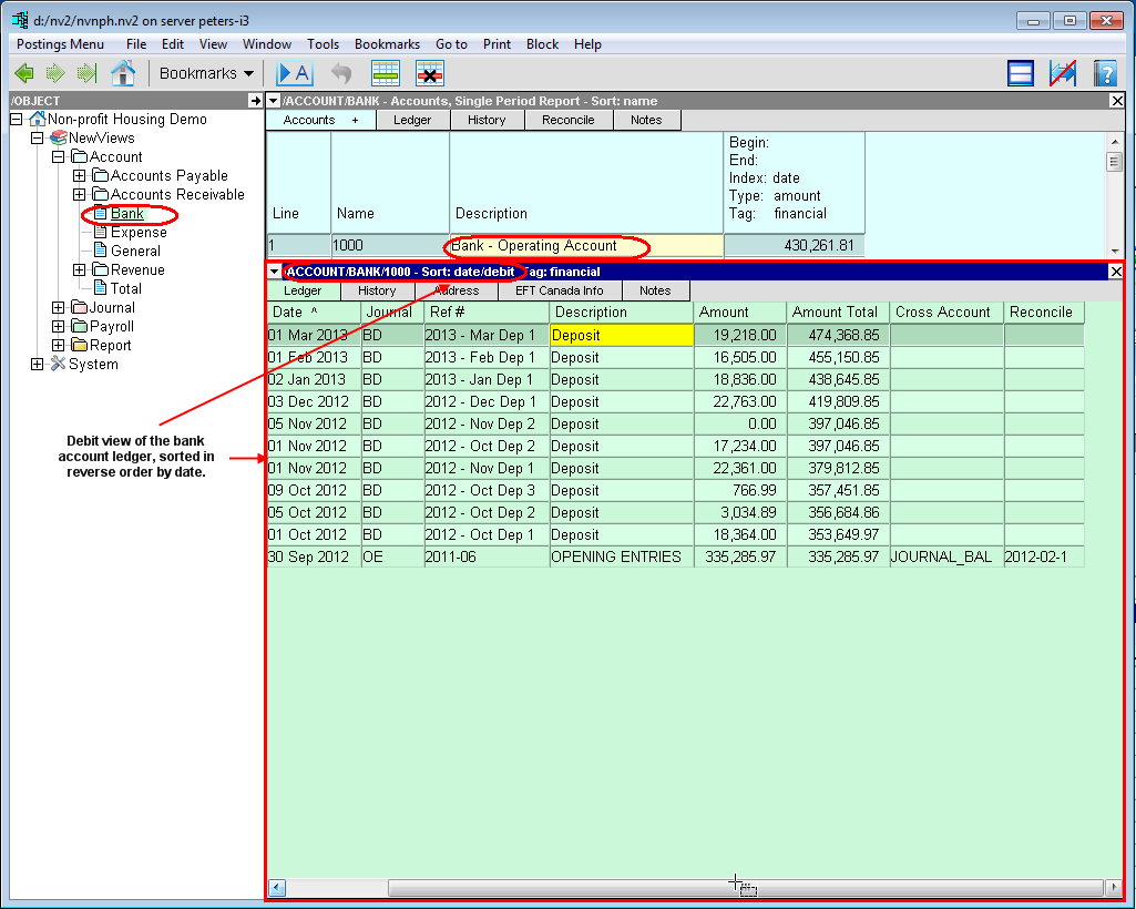 As another example, let's consider a bank account. The ledger view displays all transactions attached to the bank account. To view those transactions more selectively, you can change the view. On the credit view of the bank account, you will only see credit transactions, such as payments by cheque, withdrawals and service charges (i.e. cash disbursements). On the debit view, you will only see deposits and other debit transactions.
