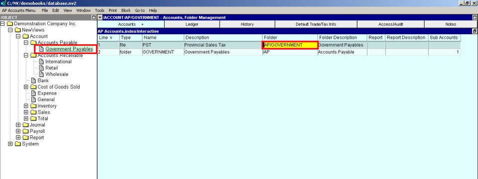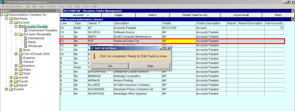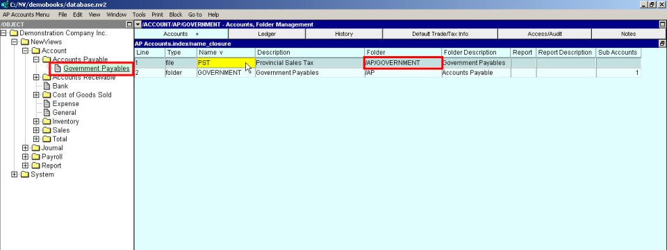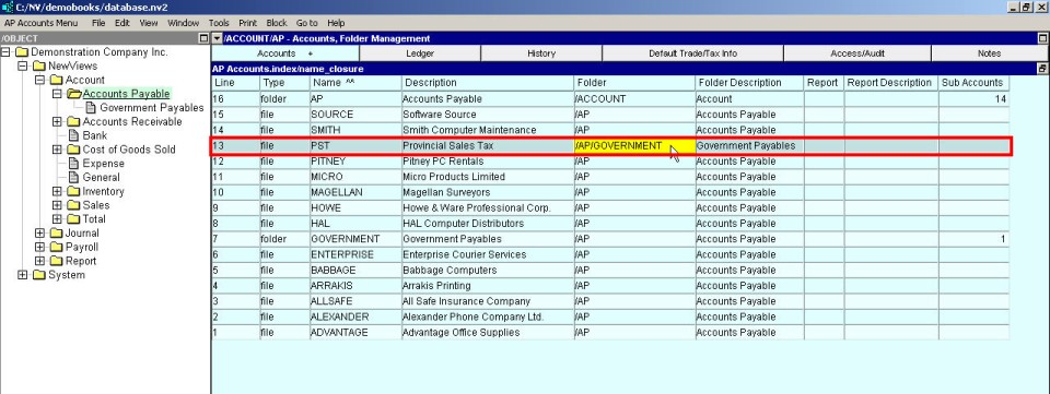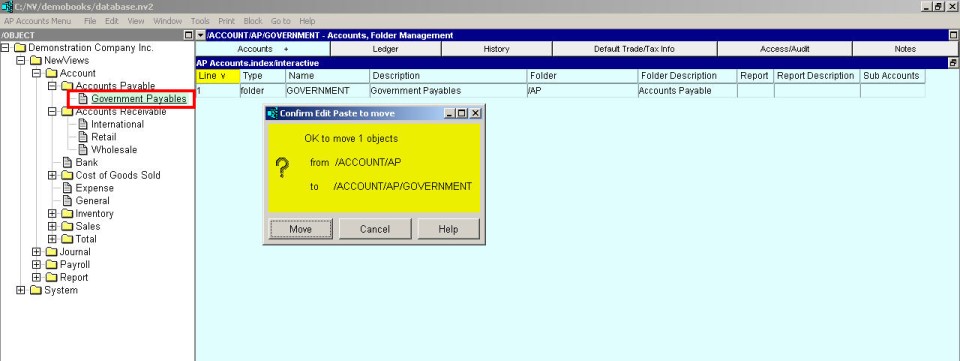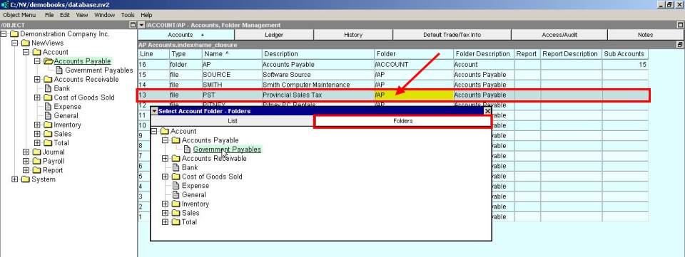 Continuing the example started in the prior section (Creating New Sub-Folders), the Accounts Payable account PST will be moved from the Accounts Payable folder to the Government Payables folder.