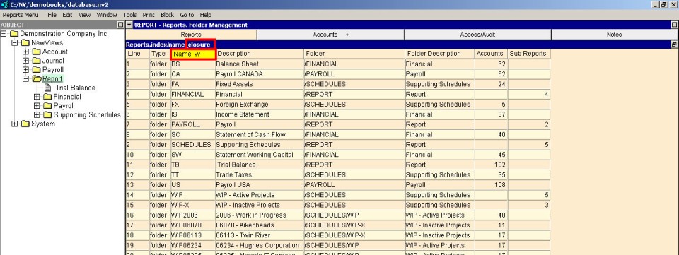 The hierarchy of reports can be rather large (accounts and journals too). There are several types of reports and within each type there could be many different reports. The obvious way to explore the hierarchy is to activate a folder and display/edit a list of objects in the folder. Another way to explore is to activate a folder and see a list of all objects in the folder, plus all objects from all folders "below" (i.e. a list of everything from the active folder "down"). Closure indexes achieve this.