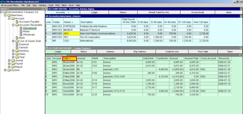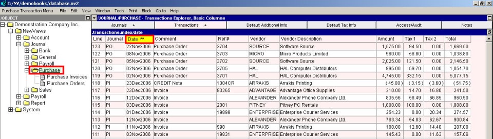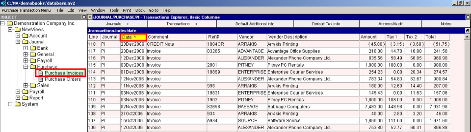 Closure indexes are kept everywhere in NewViews. Shown above is an example "branch" journal folder activated, and all purchase transactions from all journals "below" are displayed.