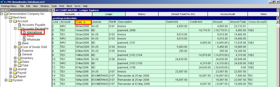 Shown above is an example "branch" account folder activated, and all ledger items from all accounts "below" are displayed.