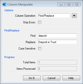 This is the view of the prompt that appears when Find/Replace is selected as the Column Operation. For the example shown below, in a description or comment column, all occurrences of values that contain "deposit" will have those characters replaced by "Deposit in Trust", no matter where in the value the characters "deposit" are located. Something like "Outstanding deposit" will be replaced by "Outstanding Deposit in Trust".