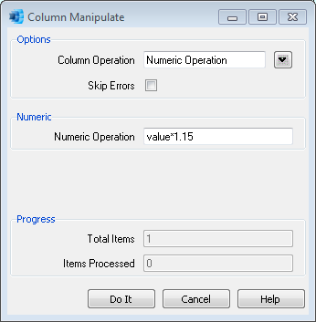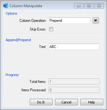 The Manipulate Column Value script is useful for finding a specified sequence of characters in the active column and replacing them with a new sequence of characters. In addition to simple search and replace functionality, you can prepend, append and insert characters, and manipulate numeric values with calculations.